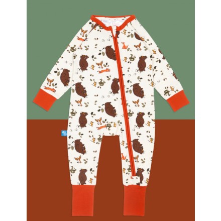 Our cream romper features an all over print of the Gruffalo with all his woodland friends, with contrast edging and cuffs in rustic tan colour.
