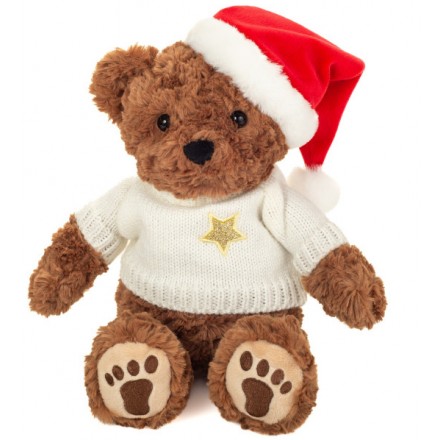 Meet this adorable cuddly soft plush teddy bear (non jointed) he is 30cm in size and wears a cosy winter jumper and a red santa hat!