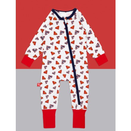 The base is crisp white, decorated with an all‑over Superman™ shield print, making this piece a standout. Bright red cuffs add bold contrast while the full length two-way zip makes dressing and nappy changes faster than a speeding bullet!