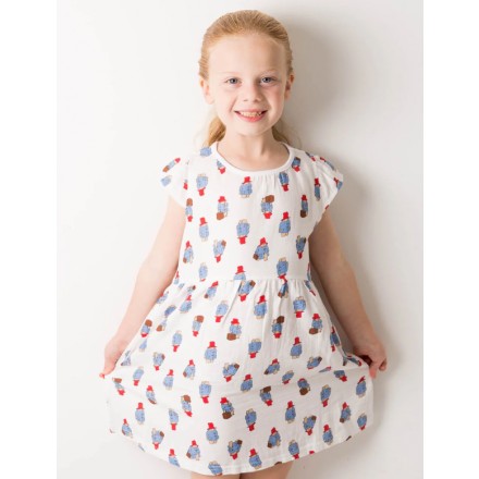 This soft cotton muslin capped sleeve dress features an all over Paddington™ print on a crisp white background, making it a charming and playful addition to any little one’s wardrobe. Designed to keep them cool and stylish, it’s perfect for warm summer days.