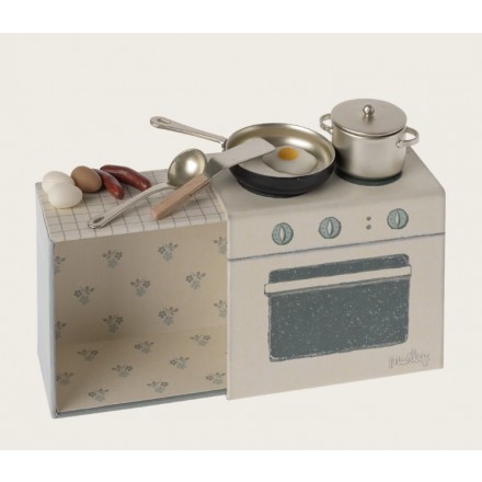 A small kitchen set for any mouse. This set include kitchen utensils, eggs and sausages to make the perfect brunch. It is packed in a paper box decorated as a small kitchen so it becomes a part of the play and storytelling.