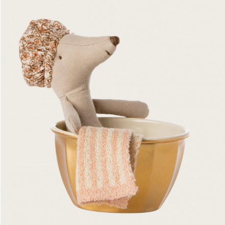 Like everyone else, this mouse loves to spend hours in the warm water in her lovely bathtub. This playset contains a golden metal bathtub, a big sister mouse, a showercap and a towel.