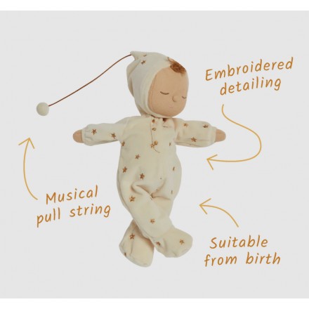 Twinkle, Twinkle Little Star, Lullaby Dozy Dinkums, here you are. With the same huggable, soft, comforting design as the most-loved Dozy Dinkums, Lullaby Lyra comes with a little pompom on the end of their bonnet which when pulled plays a sleepy tune. Baby Lyra is a special gift to welcome a newborn baby.