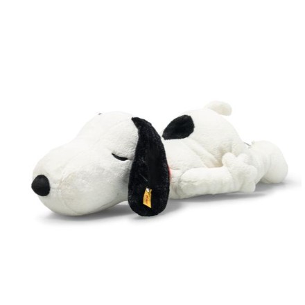 He is probably the sweetest dreamer in comic history: Charlie Brown’s dog Snoopy slumbers on the roof of his doghouse and doesn’t let anything disturb him. This particularly large plush beagle is also lying relaxed on his tummy with his ears dangling. With a casual smile on his embroidered mouth and his eyes closed, the white beagle is certainly having great adventures in his fantasy world. The weight bags filled with granules in his tummy and feet give Snoopy stability and ensure that he doesn’t fall off the roof while he sleeps.
