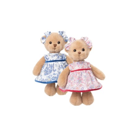 Isabelle is wearing a soft blue and white floral dress with a classic pattern. The dress features a blue waistband and delicate detailing, perfectly complemented by a matching blue floral bow on her ear. Her light brown plush fur and gentle expression make her look warm and cuddly.