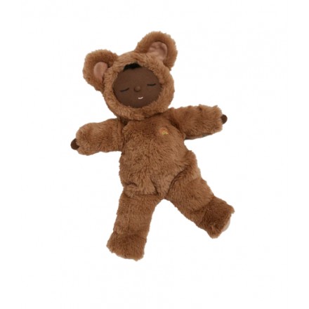 Teddy Mini is posable, made from the plushest outer and features the sweetest embroidered face with a little tuft of hair. Each Cozy Dinkum wears a non-removable suit with two soft furry ears and a rainbow right over their heart.