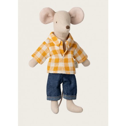 A classic Maileg item; Dad mouse in checked shirt and denim pants. This mouse fits furniture and accessories in size mouse. Buy more clothes separately. Clothes in size mum/dad fits this mouse.