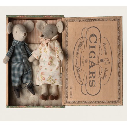 A classic Maileg mouse item. Grandma and grandpa are wearing their nightwear and beautiful shoes. The cigar box is a perfect bed for a good night's sleep. Extend their wardrobe with sets of loose clothes to create a perfect playset.