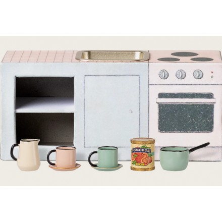 The small kitchen counter comes with 2 cups and 2 plates, a pot and a pitcher and a small can. The small sink is made of metal to look as real as possible. It fits perfectly into the kitchen in the SuitCasa mouse house.