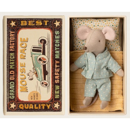 A classic Maileg item, this mouse is ready for hours of play and sleeps soundly in its little matchbox. The clothes and bedding are made of soft fabrics with unique prints in beautiful colors. The mouse has magnets in its hands.
