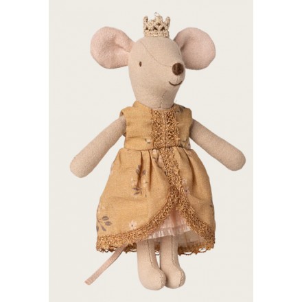 A real princess mouse in a big sister size. She is dressed up in her best dress with beautiful details and a golden crown. She fits perfectly into the Maileg castle.