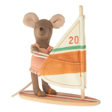 Vacation time. This mouse is ready for a day at the beach. She is wearing a swimsuit and brings her surfboard as she prefers to use the time on the sea. The surfboard and mast are made of wood.