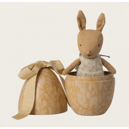 Inside this metal egg, printed with a beautiful print and a big soft bow on top, you will find a small soft rabbit which is dressed in a dotted suit. A perfect gift for the small ones. Rabbit has magnets in hands so it can hold around the egg