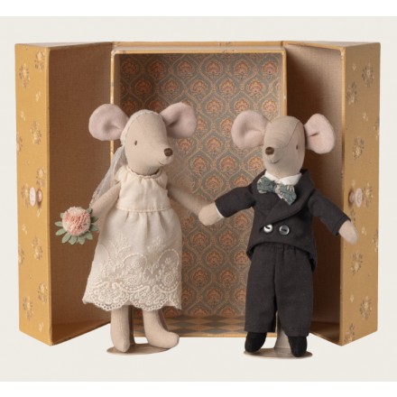 A beautiful love story that starts on the wedding day of these two mice. They are dressed classically in a long white dress, lace veil, bouquet and tuxedo. They come in a beautiful box decorated with Maileg print.
