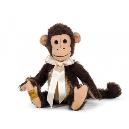 Milo's enchanting expression is sure to capture the hearts of everyone who meets him. His peachy-beige wool felt hands, feet and smiley face beautifully accompany dark-mahogany mohair, while an authentic curly monkey's tail truly brings his character to life.