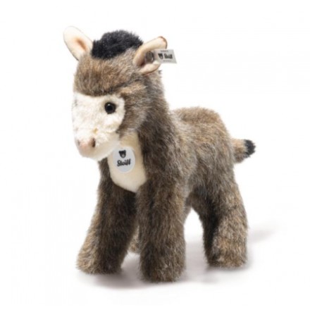 Asinus the donkey impresses with his calm presence and gentle gaze. Measuring 17 cm, he is made from especially soft brown plush, with a deep black mane that contrasts beautifully with the light beige tones on his face and ears. Delicate airbrush accents enhance his natural expression. With the classic Steiff “Button in Ear“, he stands for loving design and lasting quality. A peaceful little companion who radiates serenity and invites you to cuddle.